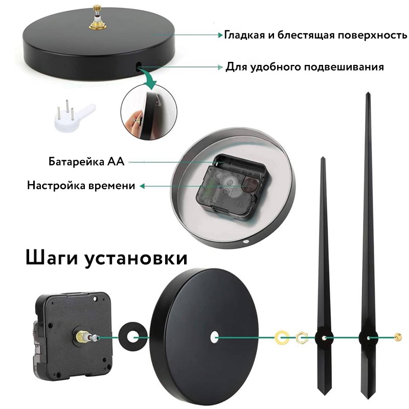 Диаметр механизма на который крепятся стрелки | 10 см, высота 2 см |