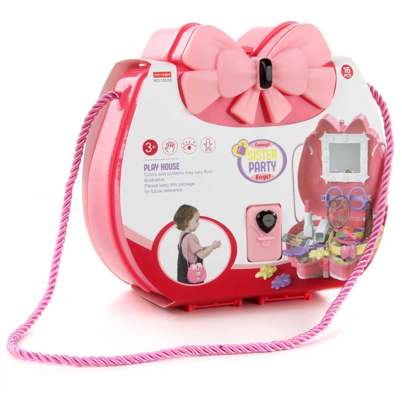 Детский косметический набор сумка для макияжа с зеркалом – это стильная розовая сумочка, в которой масса девичьих мелочей ну прямо как у мамы (здесь и помада, и духи).