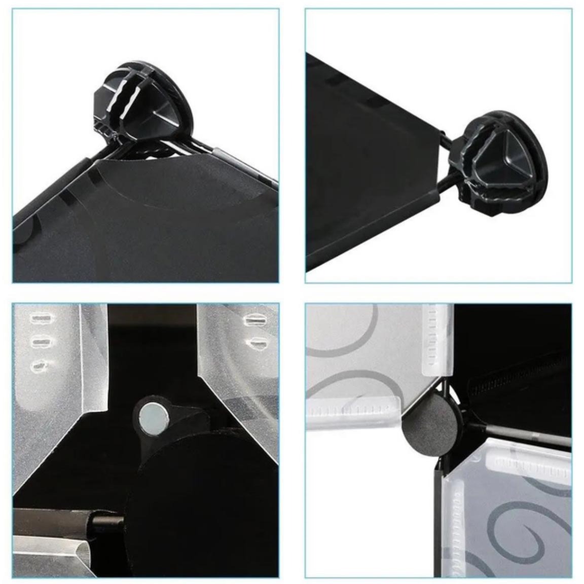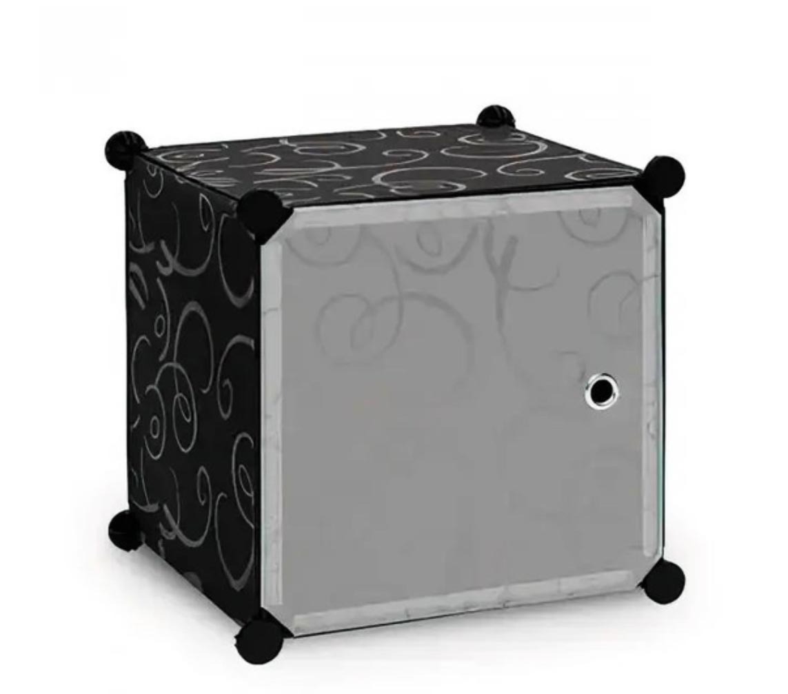 Шкаф изготовлен из полипропиленовых пластин, усиленных металлическим каркасом и соединительными элементами ABS. Стенки шкафа соединяются посредством предусмотренных уголков. Благодаря магнитам дверь прекрасно закрывается. Также вы можете не устанавливать дверцу и оставить стеллаж открытым. Этот шкаф кубической формы представляет собой универсальный блок, который можно свободно собирать и настраивать в соответствии с различными потребностями хранения.