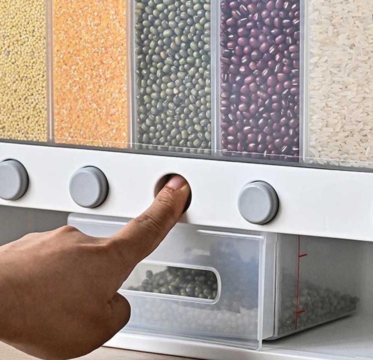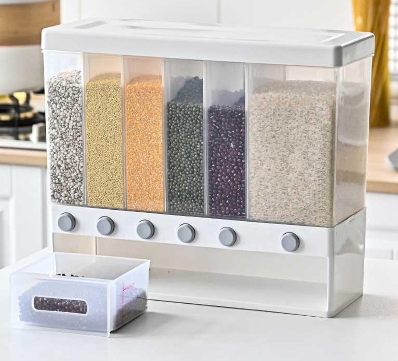 Диспенсер оборудован 6 удобными отсеками, 5 отсеков меньшего размера и 1 большой. Это позволяет хранить разнообразные сыпучие продукты, от круп до макарон, орехов и бобовых.