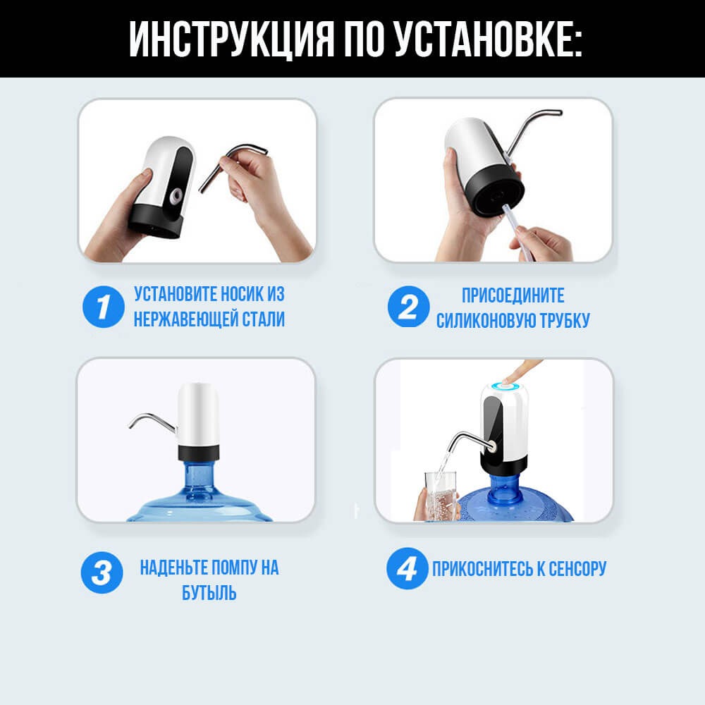 - Для установки и запуска помпы требуется только лишь надеть помпу на бутыль.