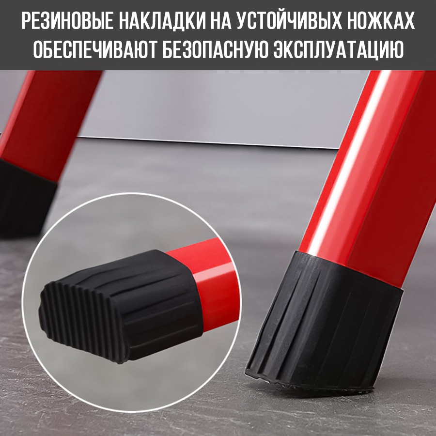 Все эти задачи Вам поможет выполнить металлическая стремянка. Инструмент изготовлен из прочного металлического профиля, ножки прорезинены, все крепления доолнительно защищены ударопрочным пластиком.