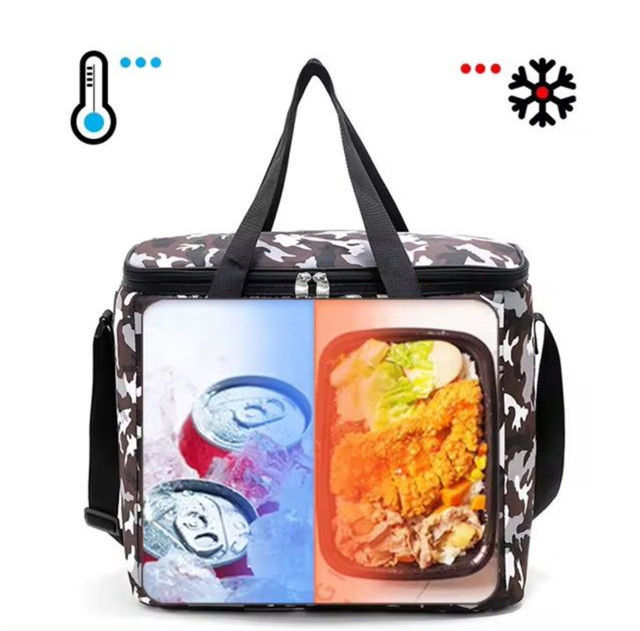 Термосумка‑холодильник объёмом 28 литров (размер 37×32×24 см) с камуфляжным принтом — практичное решение для хранения и транспортировки еды и напитков. Внутренняя часть выполнена из термоотражающего алюминиевого материала, который обеспечивает сохранение температуры до 12 часов (при использовании аккумуляторов холода). Лёгкая, вместительная, прочная и удобная в переноске благодаря ручкам и регулируемому плечевому ремню. Подходит для пикников, рыбалки, охоты, поездок и повседневного использования.