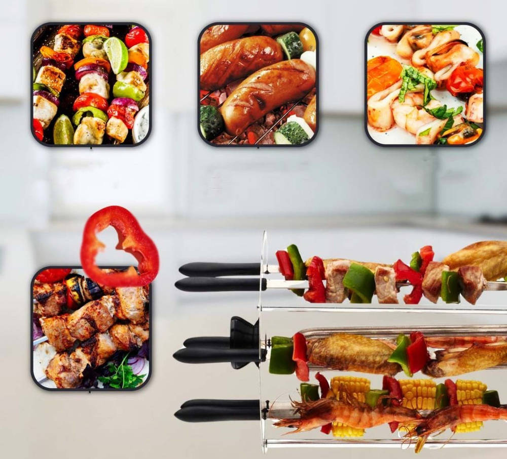 Шампура, в процессе работы прибора, вращаются с частотой 2 оборота в минуту – пища равномерно прожаривается.