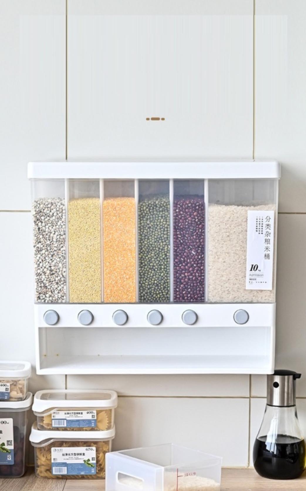 Диспенсер оборудован 6 удобными отсеками, 5 отсеков меньшего размера и 1 большой. Это позволяет хранить разнообразные сыпучие продукты, от круп до макарон, орехов и бобовых.